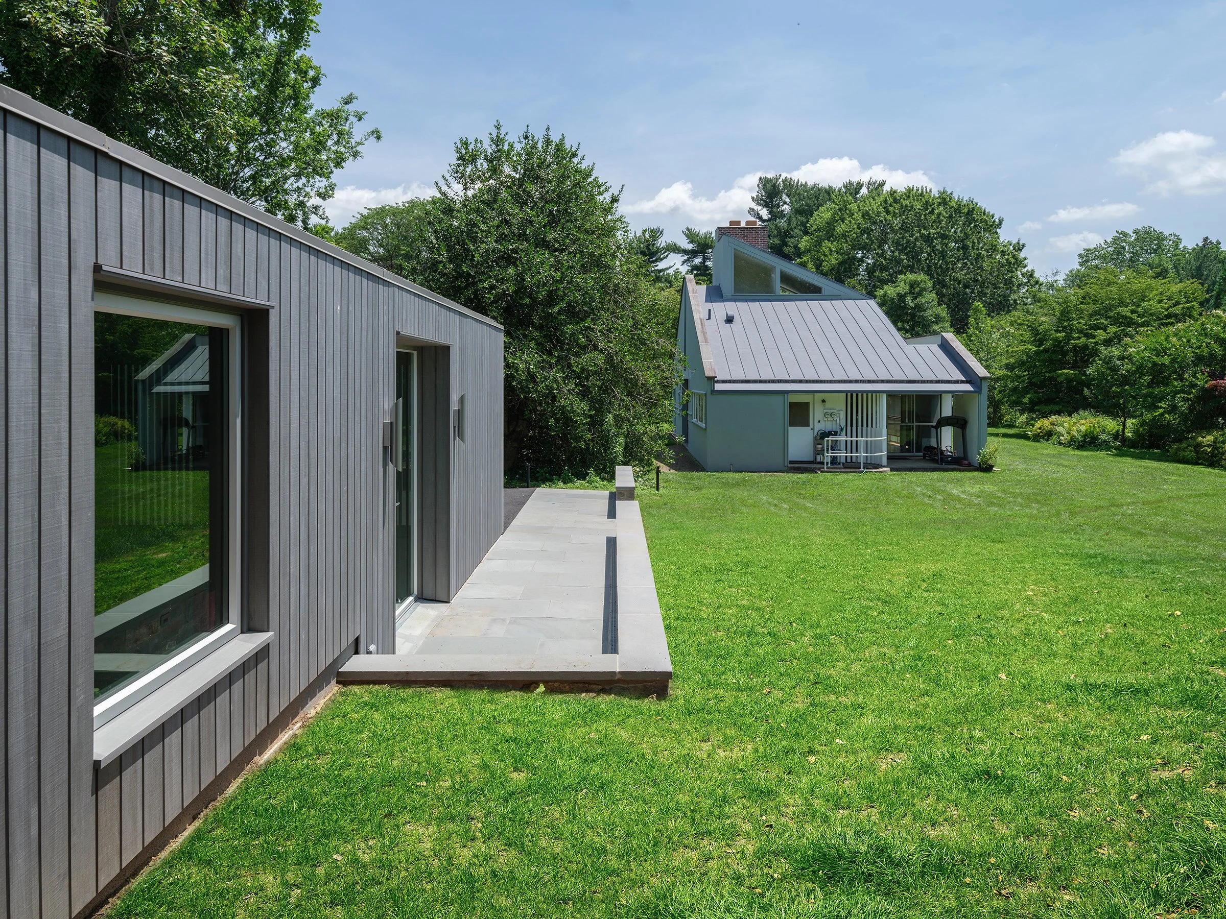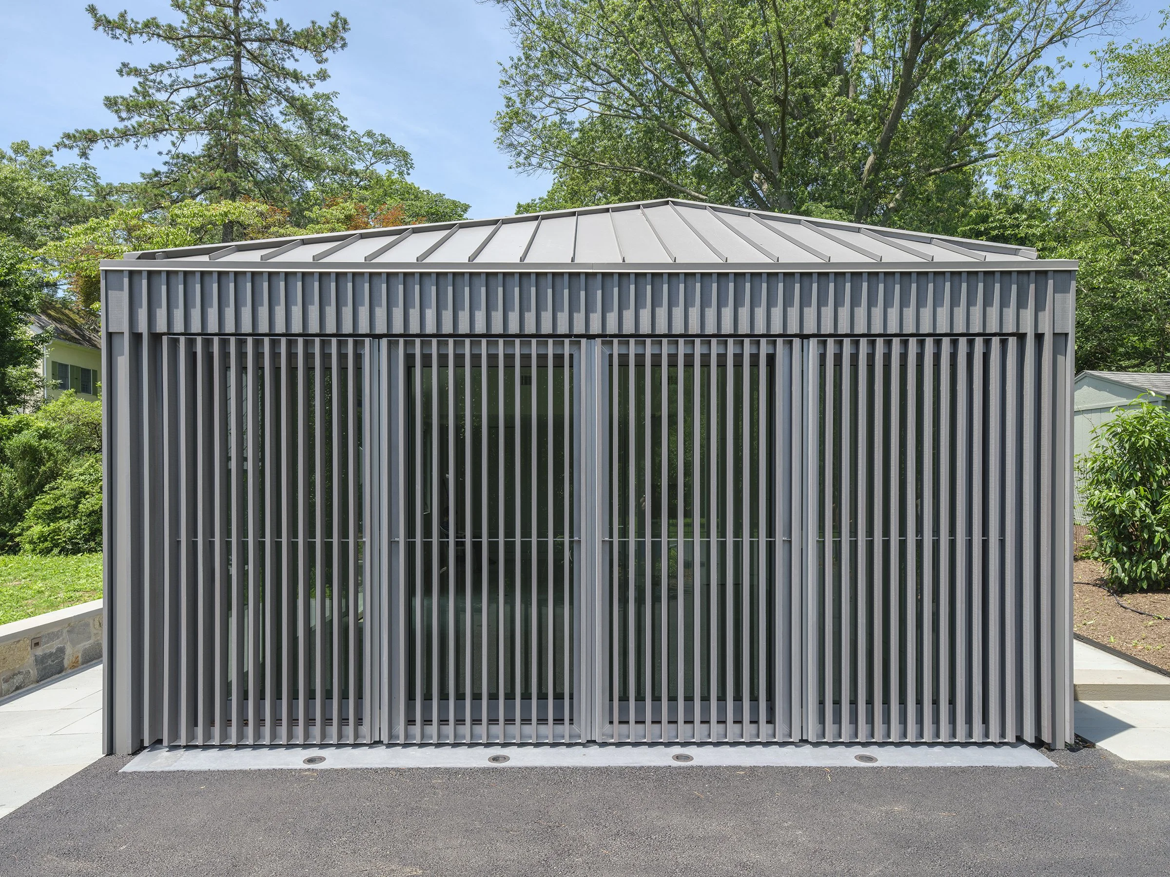 completed - THE VANNA VENTURI HOUSE, A FAMOUS HOUSE DESIGNED BY ARCHITECT ROBERT VENTURI FOR HIS MOTHER, IS ADDING A BACKYARD ACCESSORY BUILDING ON THE SITE. IT IS AN HONOR TO BE ABLE TO CONTRIBUTE TO THIS VERY IMPORTANT iconic site designed by robert venturi. THE INSPIRATION for the accessory building DRAWS FROM JAPANESE WOODEN HOMES - UNDERSTATED IN DETAILS, WITH A LONG LOW STRUCTURE SET ON SLAB WITH A GENTLY SLOPED asymmetrical ROOF. THE EXTERIOR WILL BE CLAD IN A GRAYISH NEW ZEALAND PINE THAT WILL HARMONIZE WITH THE WELL-KNOWN GRAYISH GREEN FACADE OF THE VENTURI HOUSE. the mass is meant to complement the vanna venturi house, with a simple but dynamic form that has sharp lines, accentuated by cutting into the mass.